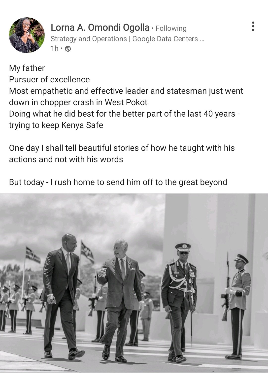 Umukobwa wa Gen Ogolla, Lorna yashyize hanze ubutumwa bw'akababaro, agaragaza ko Se yari umugaba w'ibikorwa kurusha amagambo kandi ko asoje urugendo rwe akora ibyo yari amaze imyaka 40 akora neza nk'umusirikare urinda ubusugire bw'igihugu.